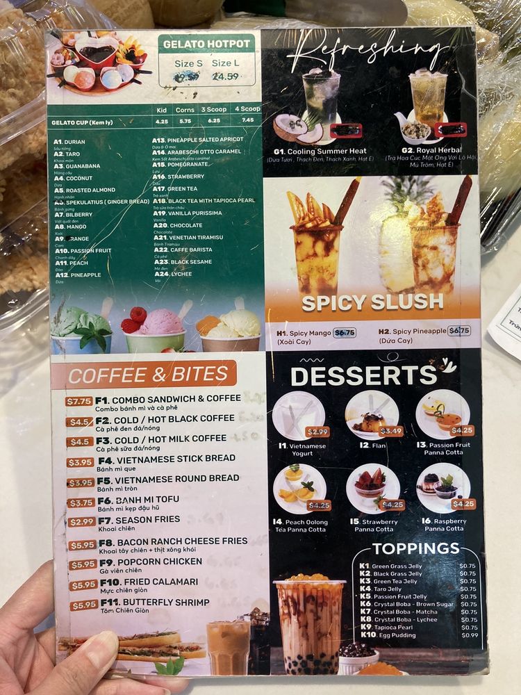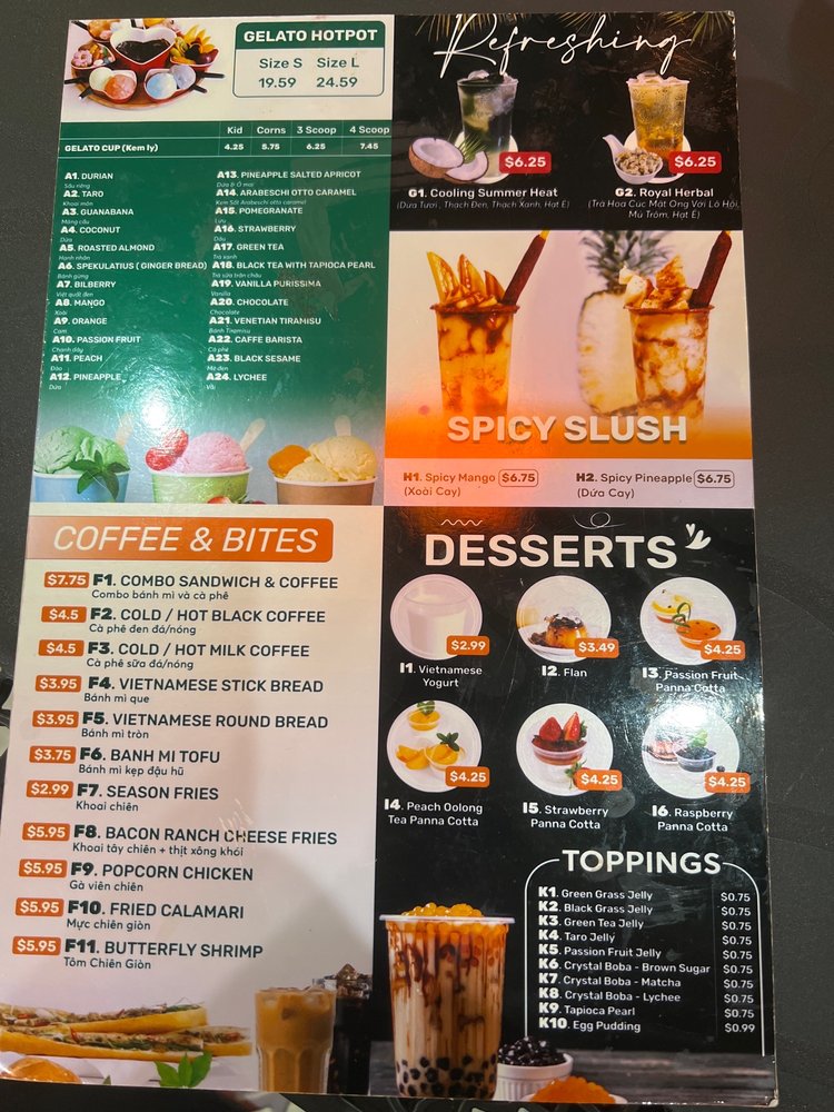 Start your culinary adventure with enticing snacks like crispy Fried Calamari and flavorful Vietnamese Stick Sandwiches, perfect for sharing. Treat your taste buds to refreshing beverages, including the Cooling Summer Heat and Royal Herbal, which perfectly balance out the spices of your meal. Don't forget to indulge in their creamy gelato, a sweet way to end your visit.